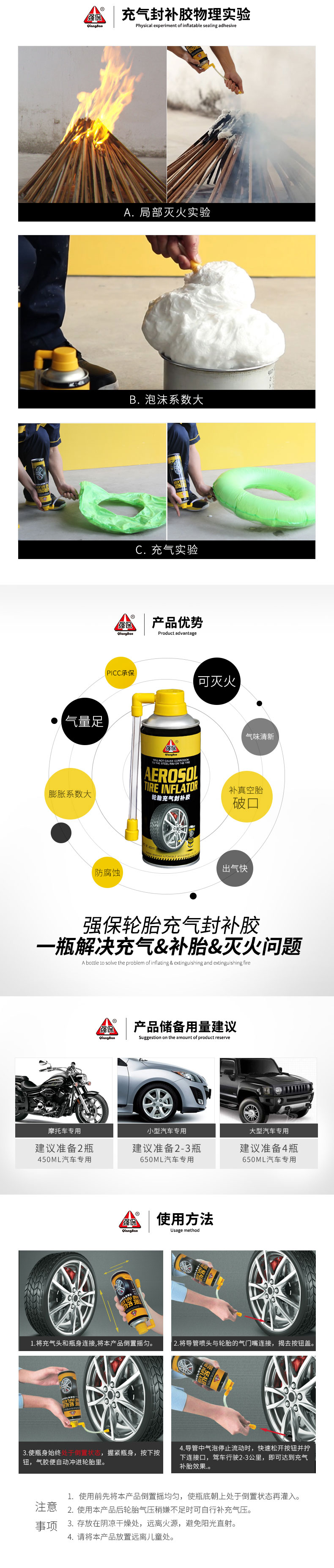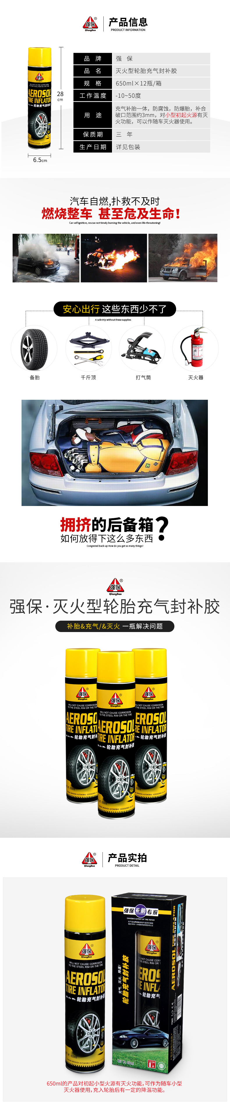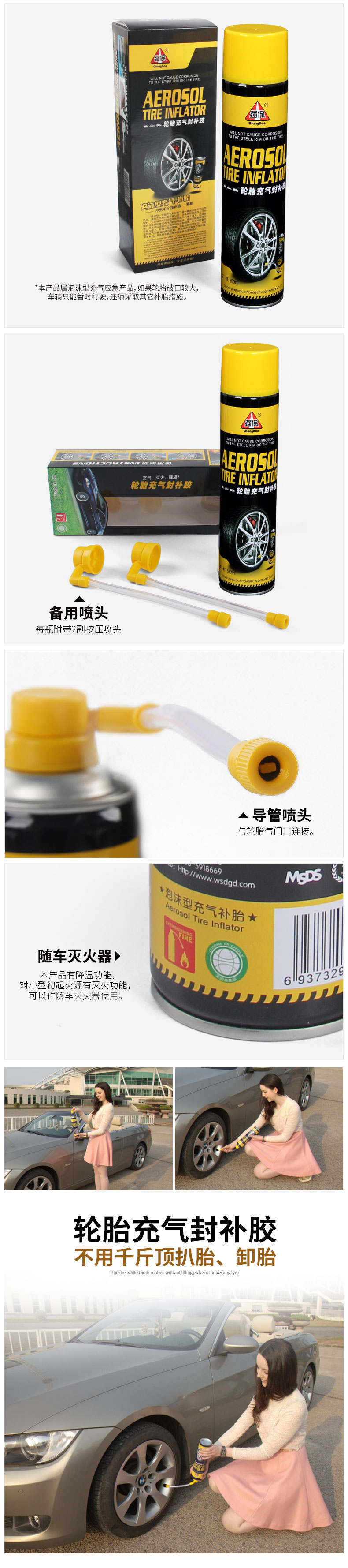 - Use Inflatable tire repair, anti-corrosion, explosion-proof tire, fill and break range of about 3mm, fire extinguishing function for small initial fire source, can be used as a fire extinguisher